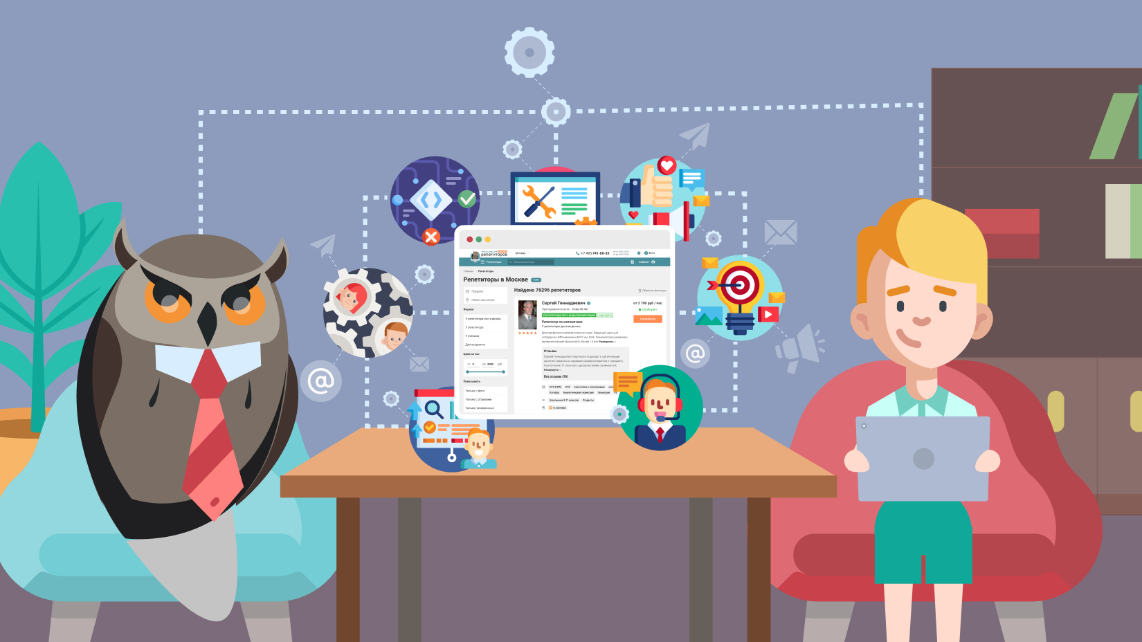 б) работаем с репетиторами — регистрируем новых и помогаем уже зарегистрированным. Помимо алгоритмов в процессе каждый день участвуют несколько десятков сотрудников кол-центра.